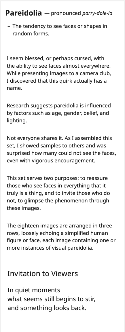 The images were submitted as prints to meet requirements of the Photographic Society of New Zealand Fellowship (FPSNZ) Honours in 2026.
